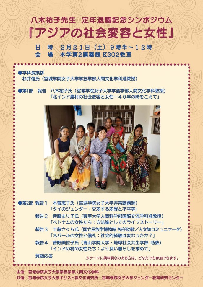 人間文化学科の八木祐子先生は、今年度末をもって定年退職されます。これを機会として、先生の指導を受けられた方々が先生とともにシンポジウムを開かれることになりました。