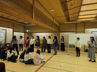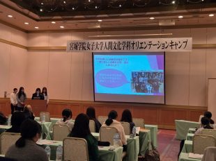 次の日の午前中は、3月に行われたフランス実習の報告、そして今年度の国内(奈良)実習、海外フィールド実習(フィリピン)の説明や人間文化学会の紹介が行われました。その後大学に戻り、在学生の学生リーダーによる学内案内ツアーが実施されました。そして無事新入生の履修登録も終わり、秋保名物のおはぎが配布され、オリエンテーションキャンプも終了。新入生のみなさんにとっては友達もできて盛沢山の充実したオリエンテーション・キャンプとなったと思います。