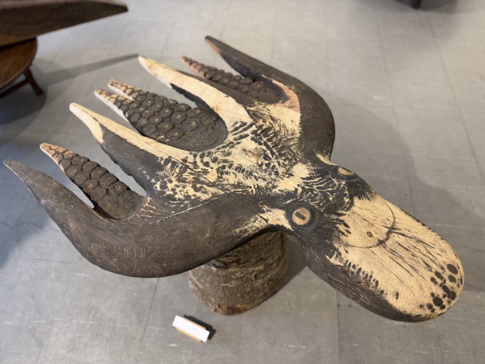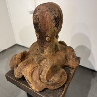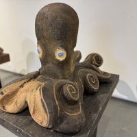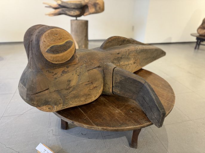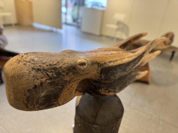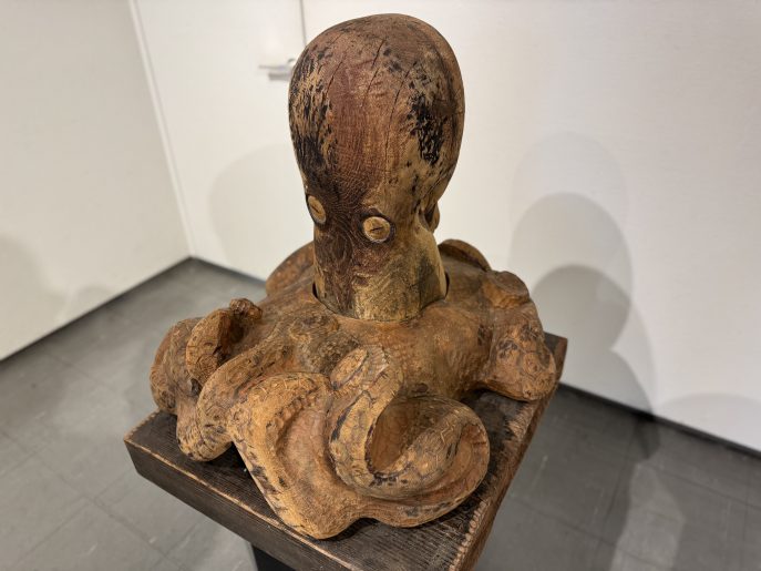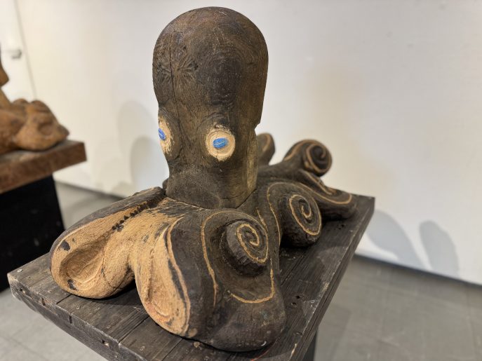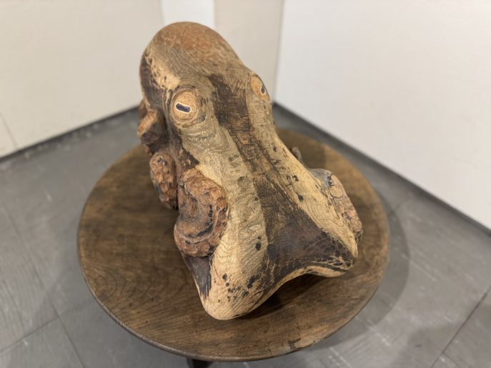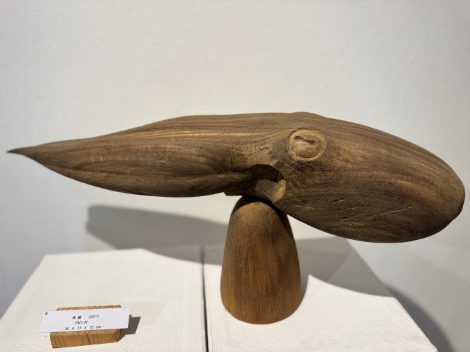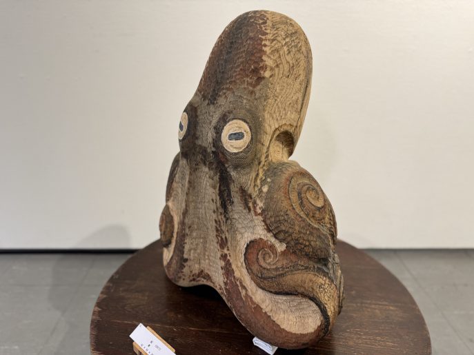会場では、石川先生が継続して取り組まれている「蛸(タコ)」をモチーフとした作品を中心に紹介しています。杉やブビンガなどの木材の質感を活かし、生命感あふれる曲線で表現された木彫作品の数々をご覧いただけます。
