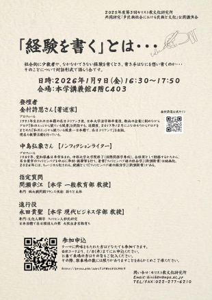 2025年度第3回キリスト教文化研究所 共同研究「多民族社会における民族と文化」主催 公開講演会『「経験を書く」とは・・・』を開催します。