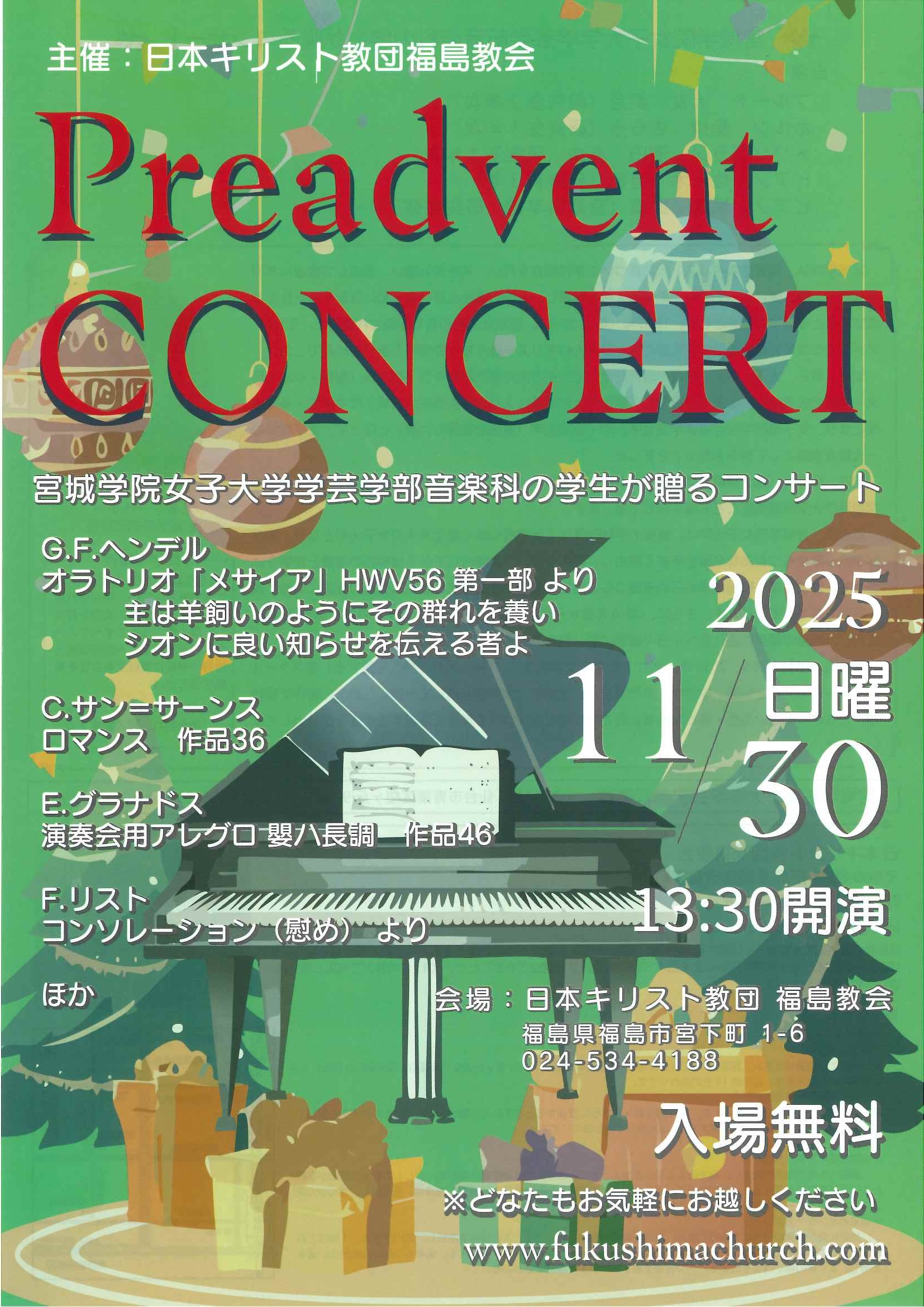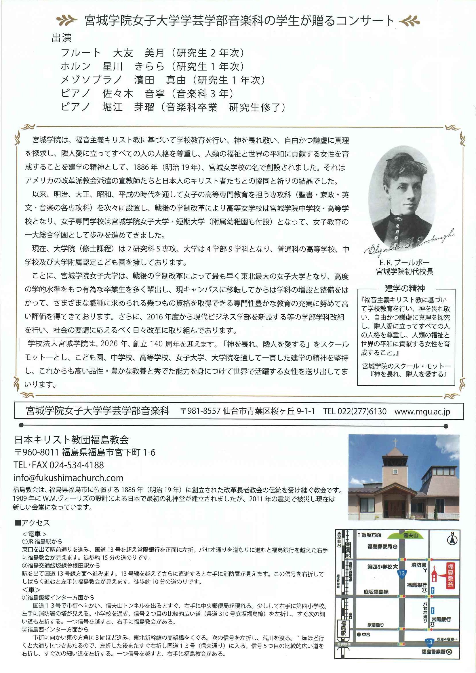 音楽科の教員、学生、研究生が日本キリスト教団福島教会主催のコンサートで演奏します。