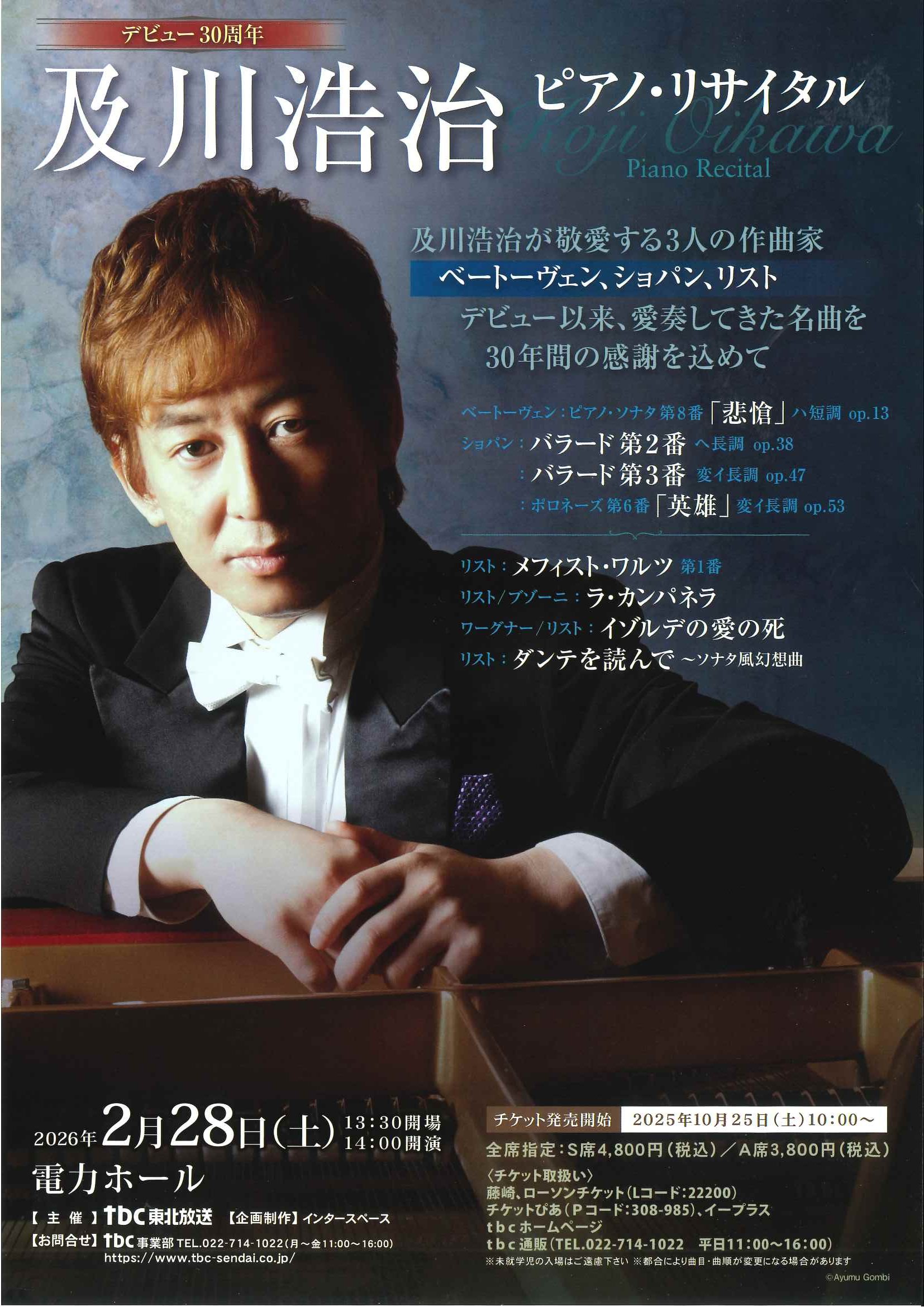 デビュー30周年を迎える及川教授が、デビュー以来、愛奏してきたベートーヴェン、ショパン、リストの名曲を演奏します。