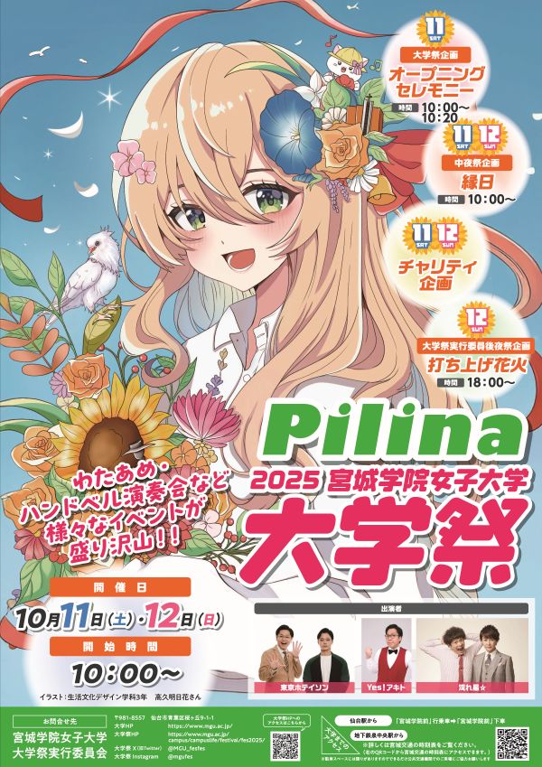 2025.10.10 お知らせ トピックス ”大学祭2025” 明日開催 今年度の「大学祭」は" Pilina"をテーマに下記日程にて開催します。 皆さまのご来場をお待ちしております。 日時:2025年10月11日(土)/12日(日) 両日ともに10:00~ 場所:本学 桜ケ丘キャンパス [アクセスマップ] ◆学長 長谷部 弘の「ごあいさつ」はこちら ◆大学祭2025特設ウェブサイト (下記画像「Pilina」バナーをClickください) ◆大学祭2025ポスター